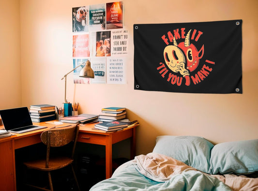 3x5 Feet Funny Quoted Flag "Fake It Til You Make It" with 4 Brass Grommets - Black Polyester Banner with the Image of a Bizarre Mask - Funny Meme Wall Decorations - Quote Flag for Outdoor or Indoor