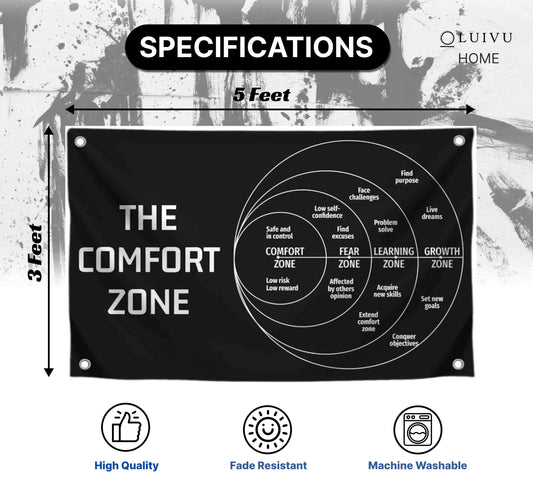 3x5 Feet Motivation Quote Polyester Flag The Comfort Zone with Four Brass Grommets - Inspirational Banner for Wall Decor - Flags for Bedroom Teen Guys Boys or Motivation for College Dorm Room Banners