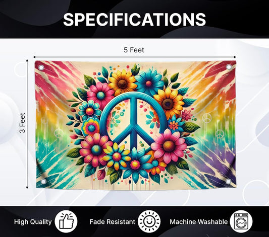 3x5 Feet Multicolored Peace Single Sided Flag with 4 Brass Grommets - Rainbow Flowers Polyester Banner for Wall Decoration - World Peace Sign Symbol Flags - Floral Holiday Farmhouse Lawn Decor Poster