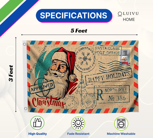 Merry Christmas Garden Polyester Flag 3x5 Feet with 2 Grommets - Happy Holiday Vintage Santa Claus Post Card for Outdoor and Indoor Home Winter Decorative - Happy New Year Single Sided Banner