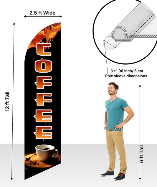 12x2.5 Feet Tall Feather Single Sided Flags "Coffee" - Coffee Flags for Businesses or Lunch - Special Coffеe Themed Polyester Flag - Windless Swooper Coffеe Tapesry Portable - Flagpole is Not Included