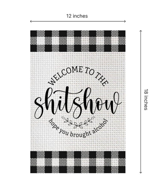 12x18 Inches Welcome to The Shitshow Polyester Flag - Vertical Buffalo Plaid Double Sided Garden Flag - Burlap Holiday Farmhouse Seasonal Yard Outdoor Decor - Hope You Brought Alcohol Poster Yard