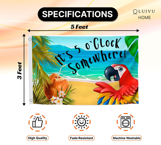 12x18 Inches It's 5 o'Clock Somewhere Polyester Flag - Double Sided Five O'clock Flags with Two Brass Grommets - Tropical Summer Beach Drinking Cocktails Banner - Pub Decoration Advertising Banner