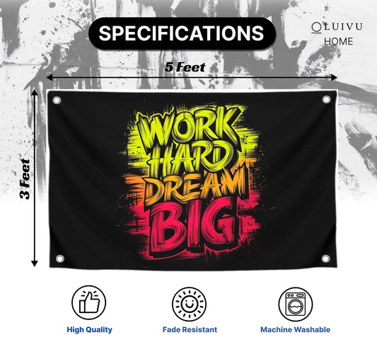 3x5 Feet Black Motivation Quoted Polyester Flag "Work Hard Dream Big" with Four Brass Grommets - Large Motivational Quote Wall Flag for Home Gym Decor - Banner Room Decor Aesthetic for Ofiice