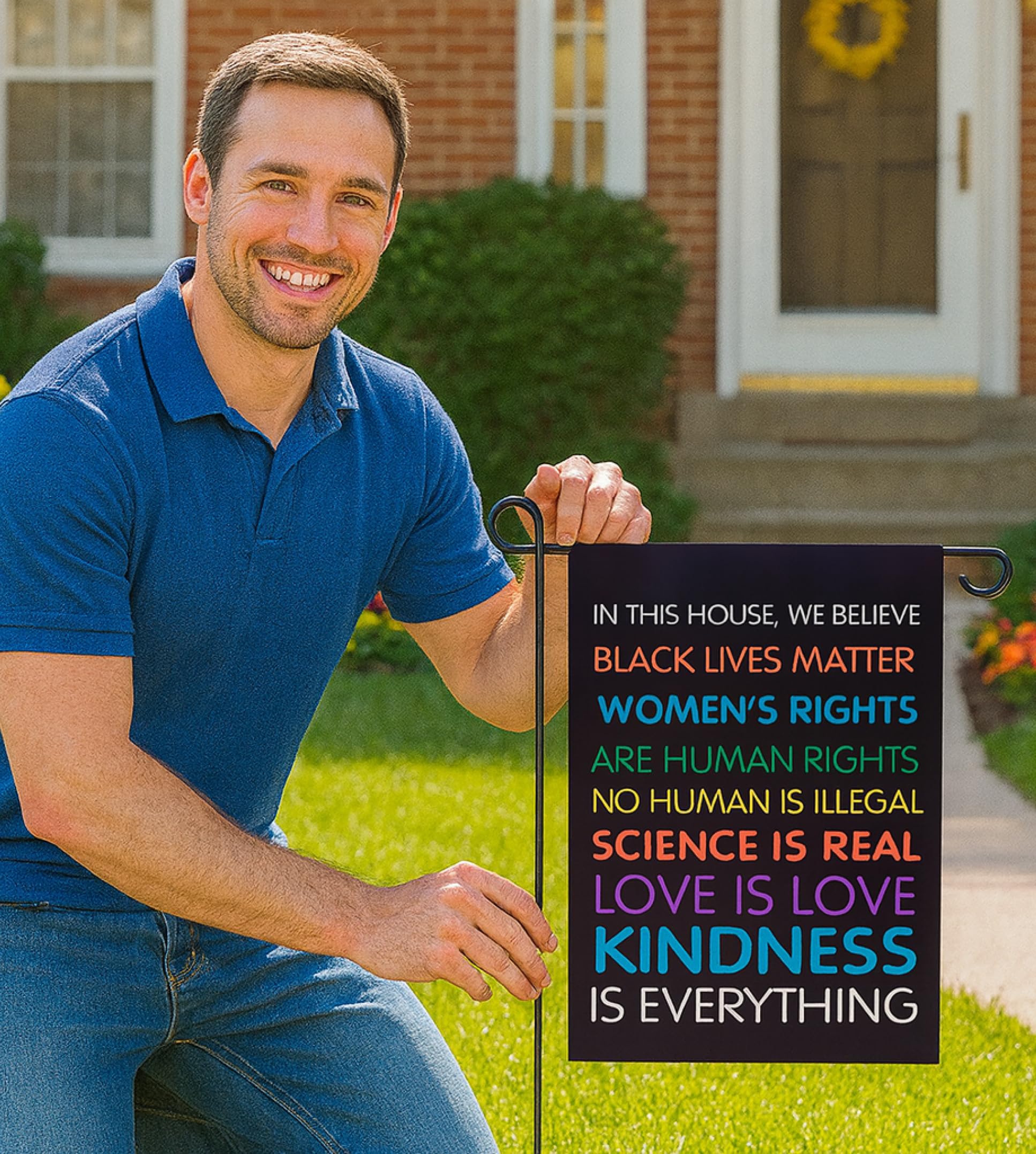 The vibrant black background of this garden flag creates a striking contrast with the "In This House We Believe" text, making it a powerful statement piece for any home exterior. Printed on both sides, this 12x18 inch flag ensures your message is visible regardless of which way the wind blows.What sets this flag apart is its exceptional durability. The weather-resistant burlap material stands strong against the elements while maintaining its bold appearance. Even better, when it needs refreshing, simply toss it in the washing machine—no special care required.Advanced digital printing technology delivers an ultra-high definition design that resists fading, keeping your Black Lives Matter and "Science Is Real" message crisp and vibrant throughout the seasons. The quality of the printing truly enhances the impact of this protest banner.As a decorative statement, this flag works beautifully in various outdoor settings. Whether displayed in a garden, on a porch, or nestled in a lawn arrangement, it adds character while clearly communicating your values.The vertical orientation fits standard garden flag holders perfectly, making installation quick and straightforward. Visitors will immediately understand what principles matter in your household through this elegantly designed outdoor decor piece.