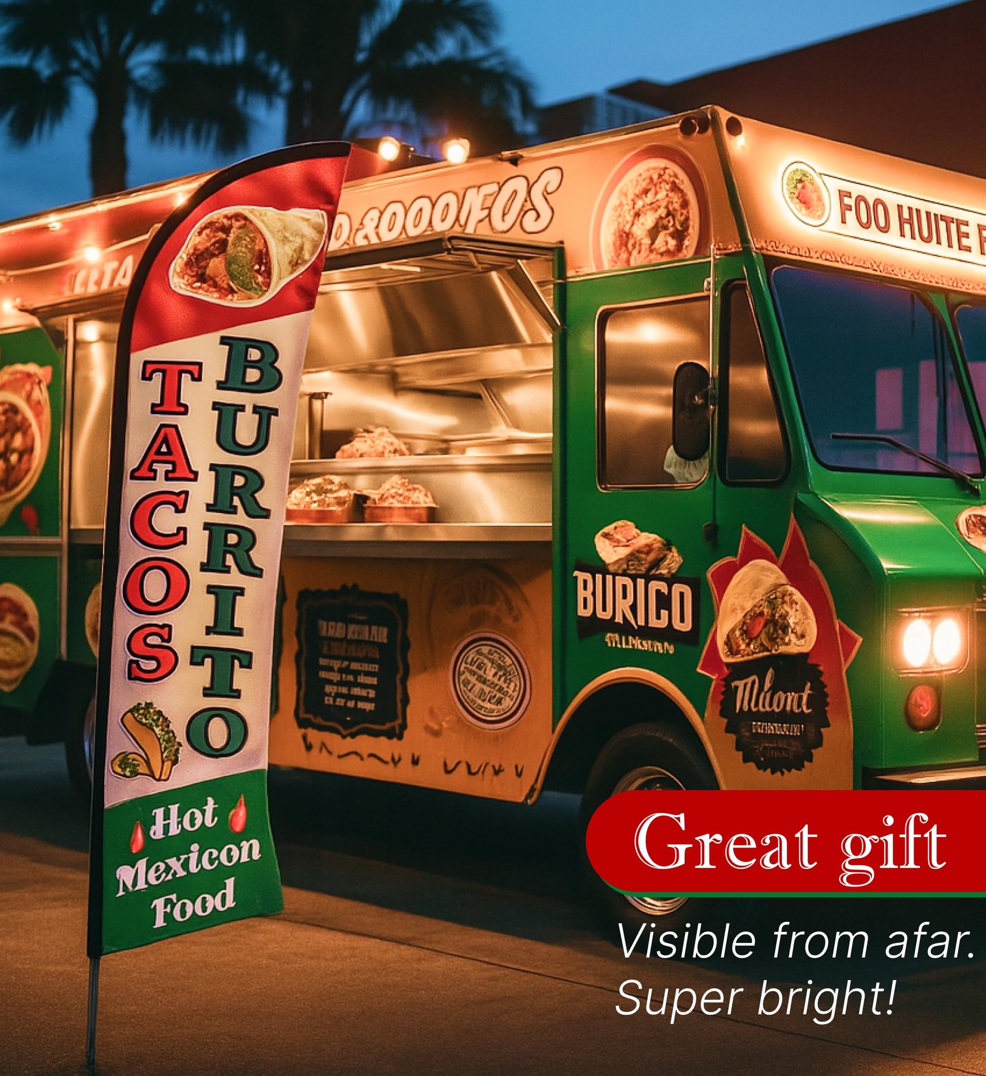 - Imported 100% polyester flag. Use these tacos and burritos feather open themed flags at the entrance near your taco trucks or storefront. Attention: this item is not suitable for cone flagpole.