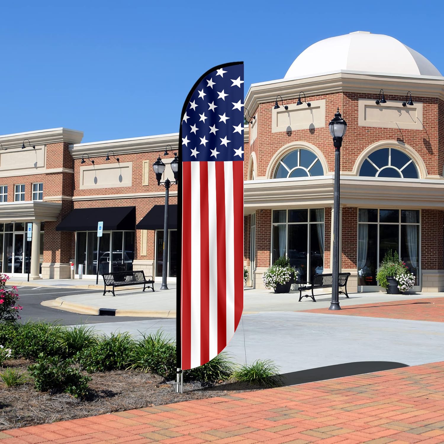 - Imported 100% polyester flag. Use these American feather flags at the entrance near your business or storefront, inviting potential customers! Attention: this item is not suitable for cone flagpole.