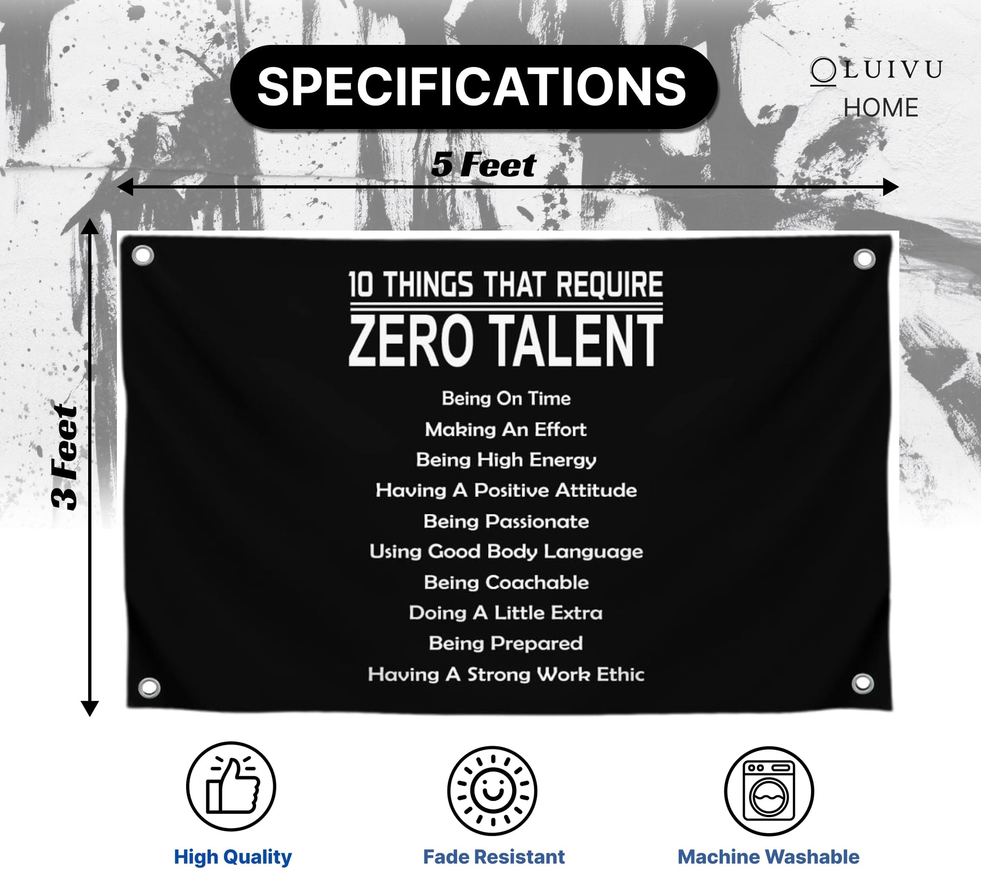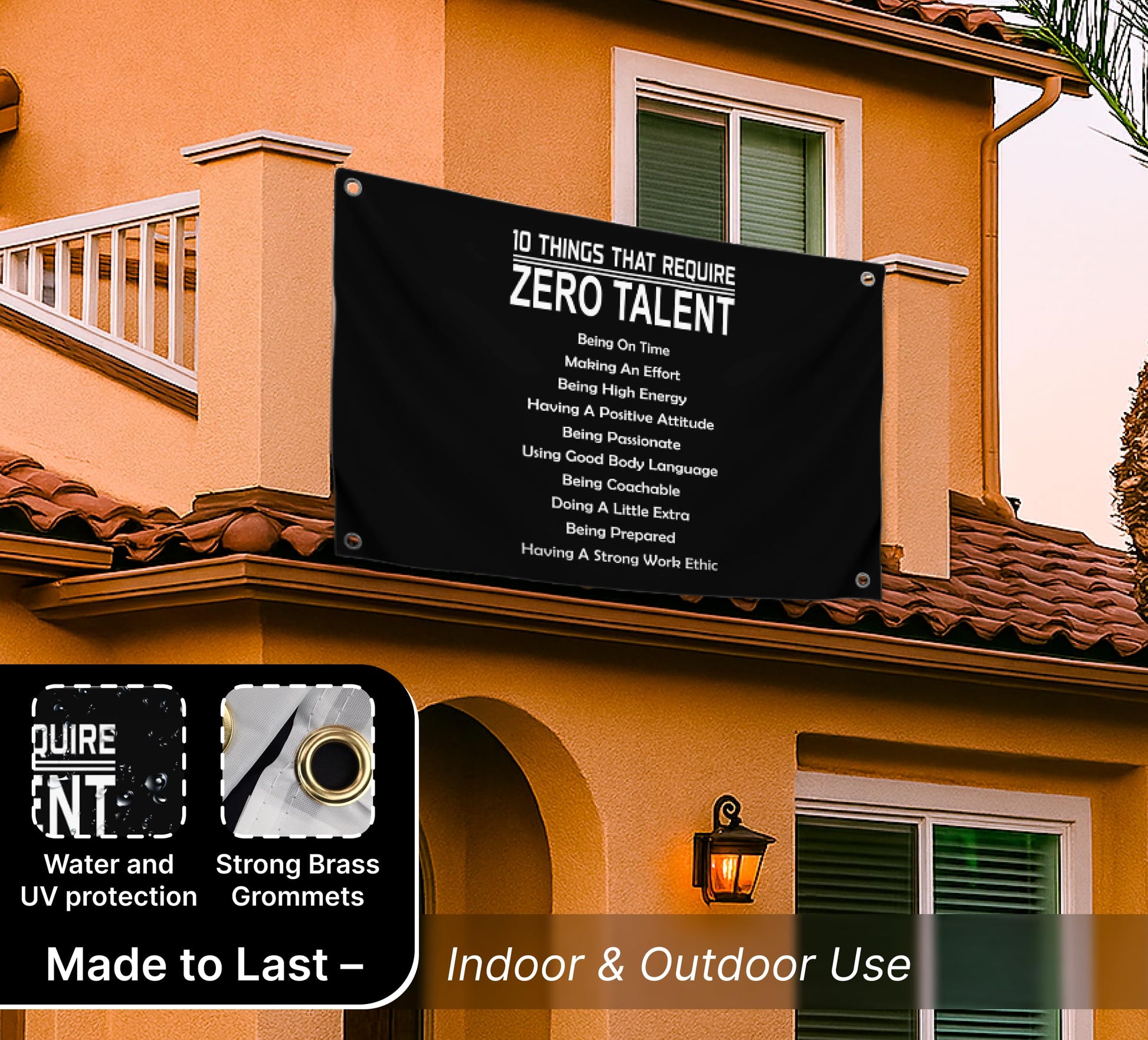 3x5 Feet 10 Things That Require Zero Talent Flag with Four Brass Grommets - Motivational Wall Art Banner for Classroom or Gym - Inspirational Home Leadership Quotes - Wall Flag for Indoor and Outdoor