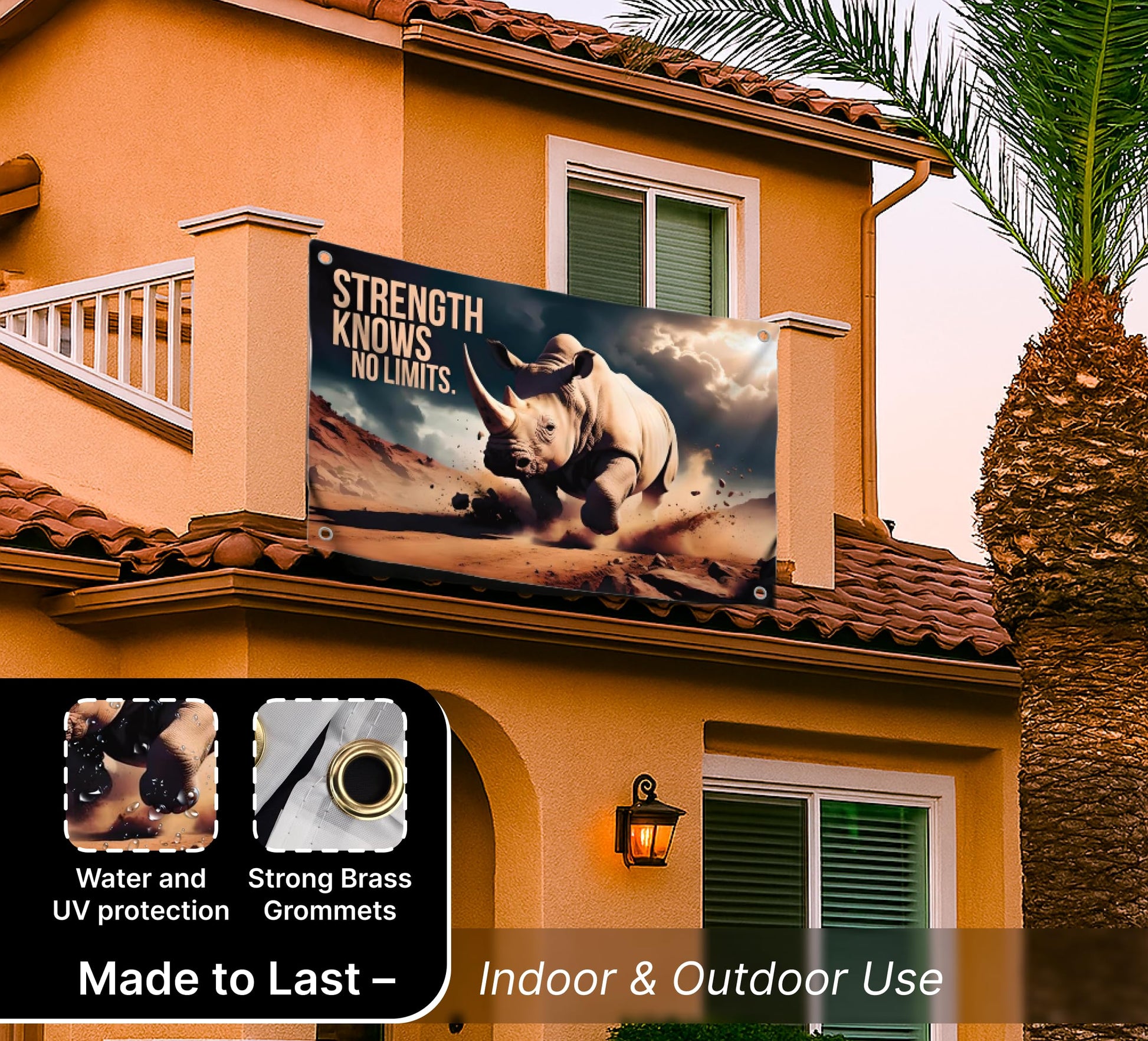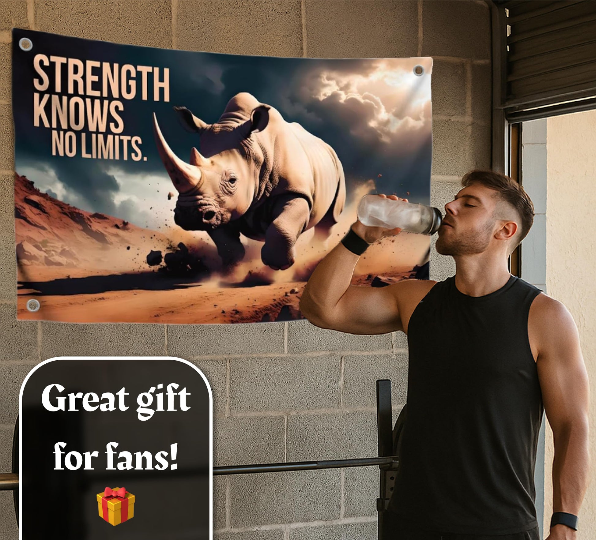 3x5 Feet Motivation Quote Polyester Flag "Strength Knows No Limit" with Four Brass Grommets - Rhinoceros Inspirational Banner for Men and Women - Motivational Gym Banner for Wall Decoration
