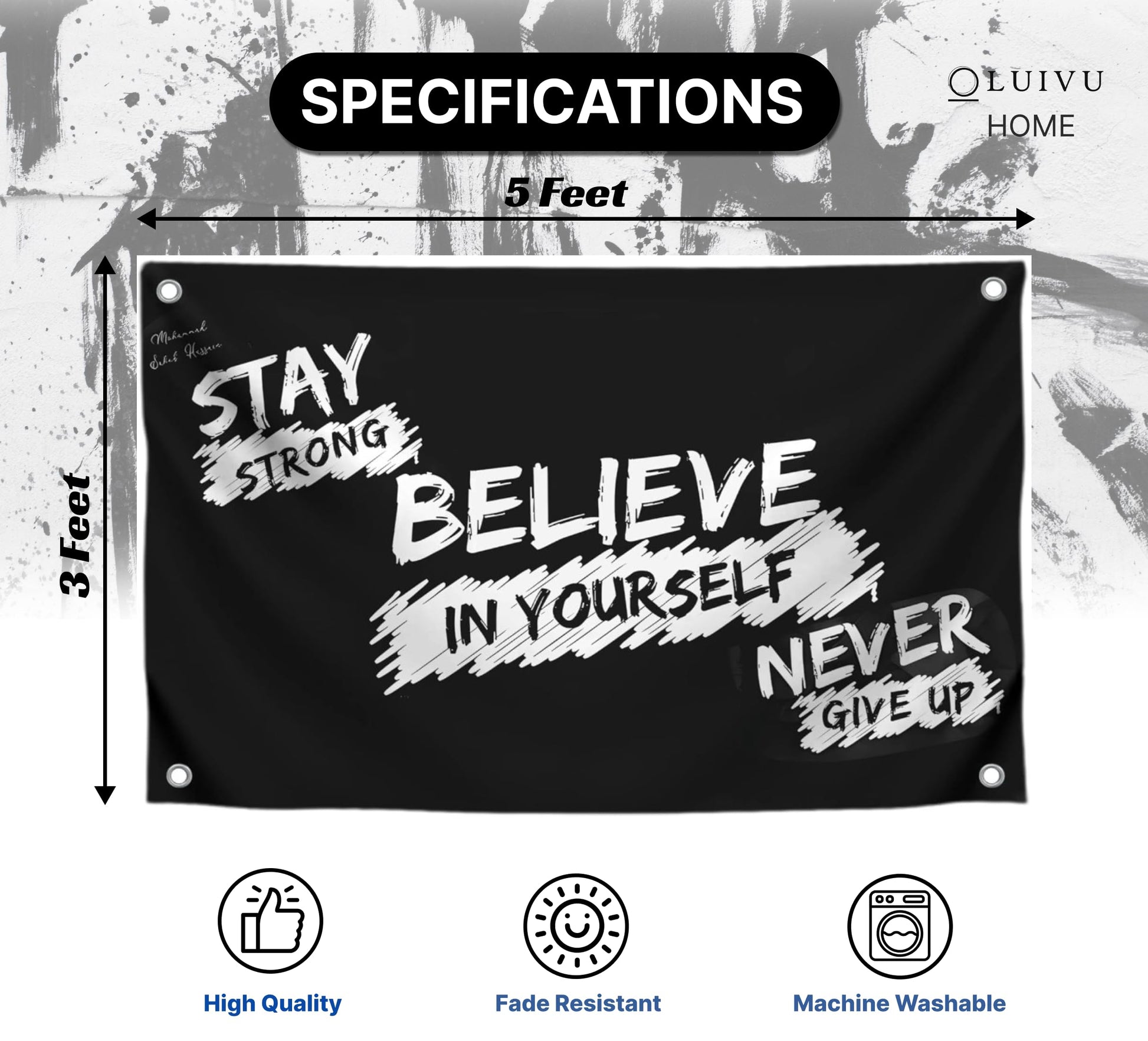 - The "Stay Strong, Believe in Yourself, Never Give Up" flag is your daily dose of inspiration. Perfect for hanging in your home gym, office, or bedroom, this flag serves as a reminder to stay resilient