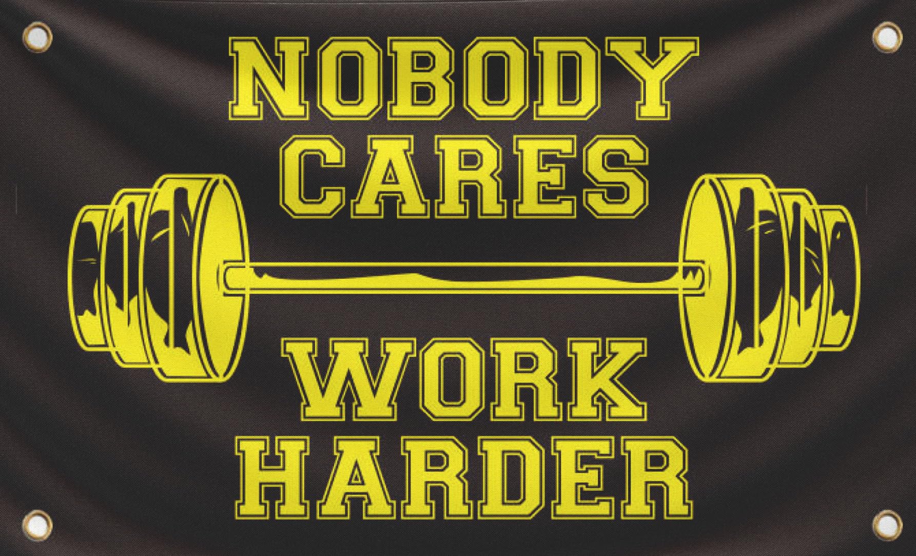 - Flags meme funny cool quotes "Nobody Cares Work Harder". Motivational flags for home, college, dorm, room, guys man, cave, bedroom and also wall poster for guys. Gym flags and banners, room flags.