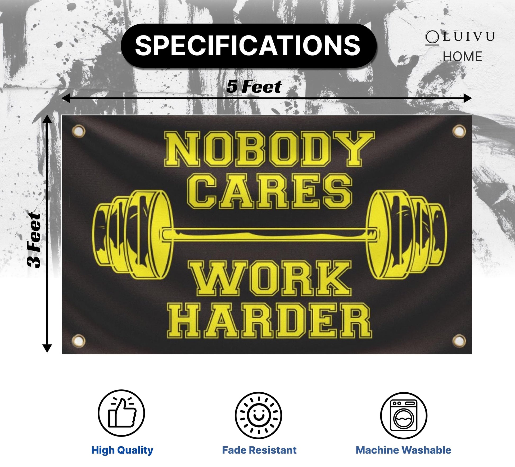 3x5 Feet Nobody Cares Work Harder Polyester Flag with 4 Grommets - Fade Resistant Single Sided Flag for Yard - Stay Motivated with Cool Art - Inspire Your Workout Banner - Fitnes Wall Decor for Gym