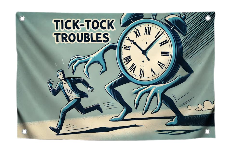 - Funny flag 3x5 ft with quote "Tick-Tock Troubles", for wall decoration and also college posters cool room flags or flags for college dorm men. Great meme flags for those who are often late.