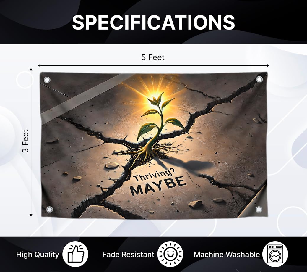 3x5 Feet Single Sided Flag with 4 Brass Grommets - Style Fantastic Flags for Bedroom "Thriving? Maybe" - Polyester Banner for Room Symbolizes Resilience - Motivational Flags Overcoming Difficulties