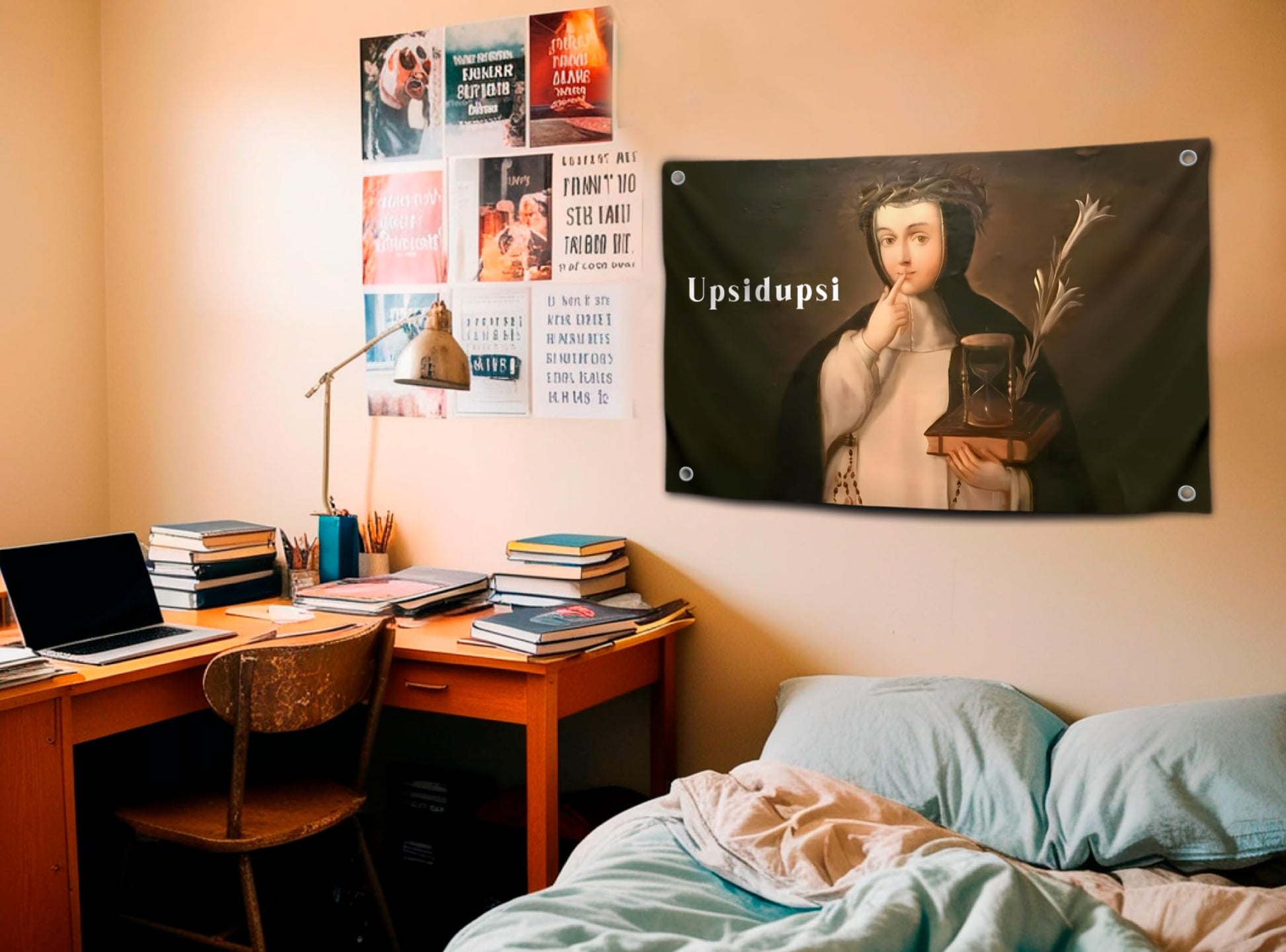 - Add a whimsical touch to your space with the upsidupsi tapestry flag! Perfect for dorms, bedrooms, or creative spaces, it’s an ideal decor piece for those who love unique and lighthearted vibes.