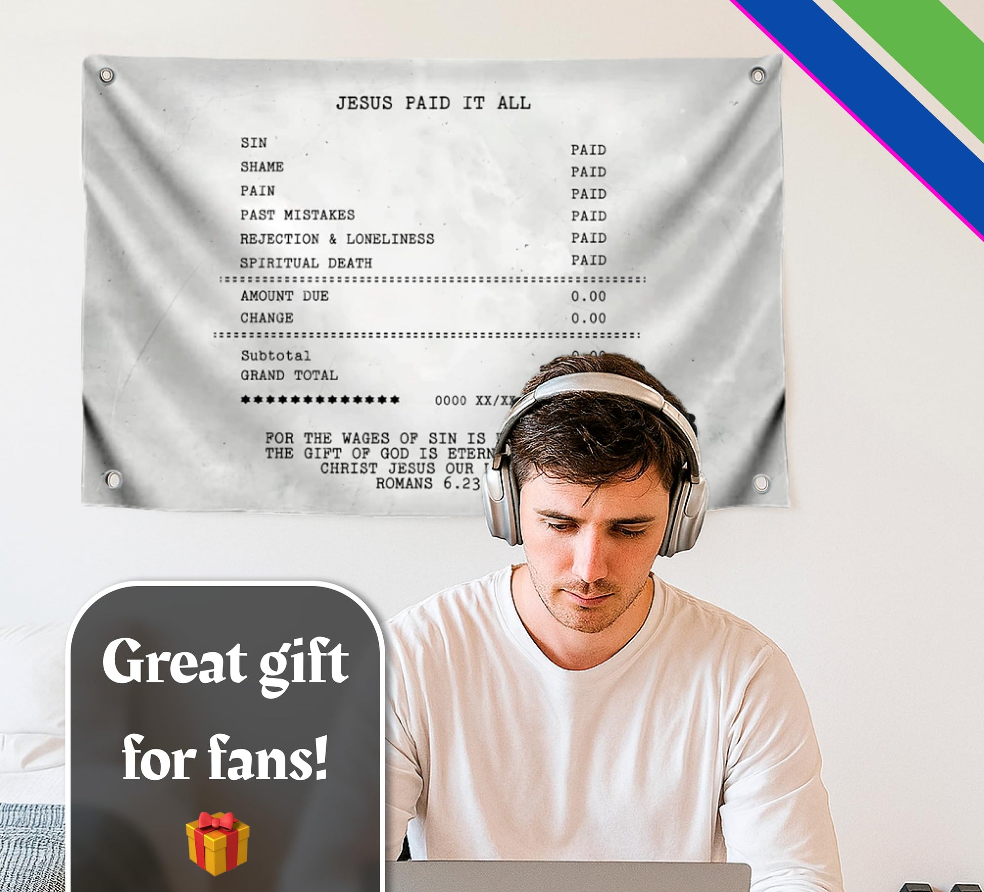 - Imported 100% polyester flag. Christian flag for room: "Jesus Paid IT All" or banners for room guys. Cool banners or religious garden flags for your room banner or wall flags for college dorm.