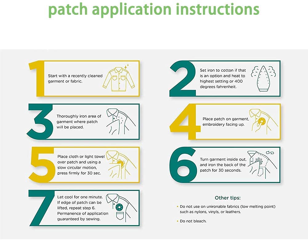 Details: Description Item Type: Sew on appliques decorative patches The steps are as follows 1. Keep the back side clean before ironing, and adjust the temperature to the temperature suitable for the clothes according to the method of using the iron. 2. Put the cloth on the appropriate position (do not tear off the glue), burn it back and forth a few times, usually about 15 seconds. 3. In order to prevent burns, you can put a thin cotton cloth on the cloth (must be cotton non-fading cloth), check the edge after ironing to see if it is hot, and burn a few times on the edge. 4. According to the thickness of the decal to determine the temperature, thicker, must be higher temperature, hot time is longer, for a particularly thick cloth, you can burn a few times on the back. 5. Special Note: For cloth with bright pieces or bright surface (because the sequins are all plastic products), be sure to put a layer of cloth and use low temperature ironing (less than 150 degrees Celsius), or use a steam iron directly. Or put a layer of damp cloth on top. In order to avoid the temperature is too high, the plastic sheet melts. 6. After ironing, use a needle thread to sew a few stitches on the side of the cloth, which is more firm and very docile.