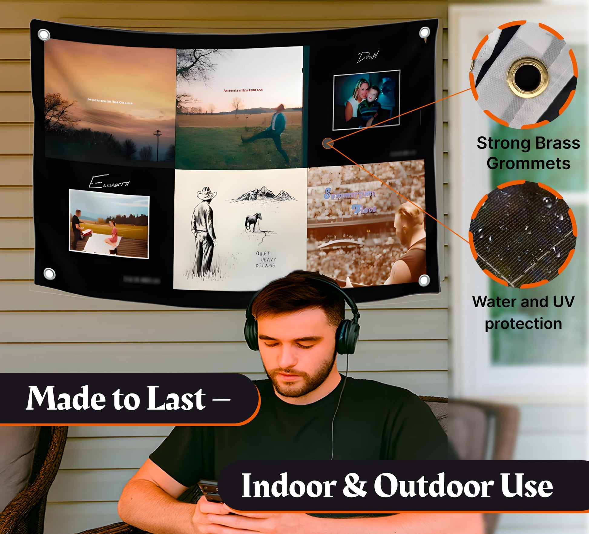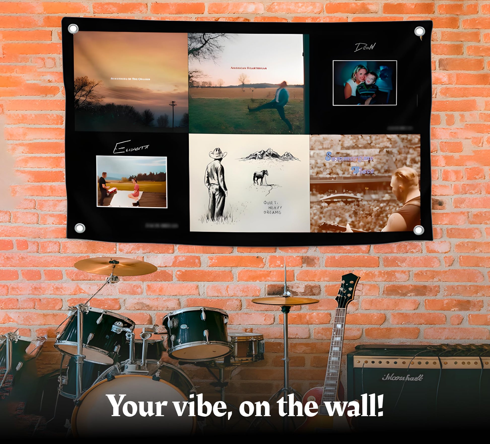 This decorative 3×5 ft banner flag (approx. 90×150 cm) features an artistic printed collage design. It’s ideal for decorating a room, studio, concert space, party, or photo shoot—especially if you want to add an atmospheric, music-inspired accent to your interior.