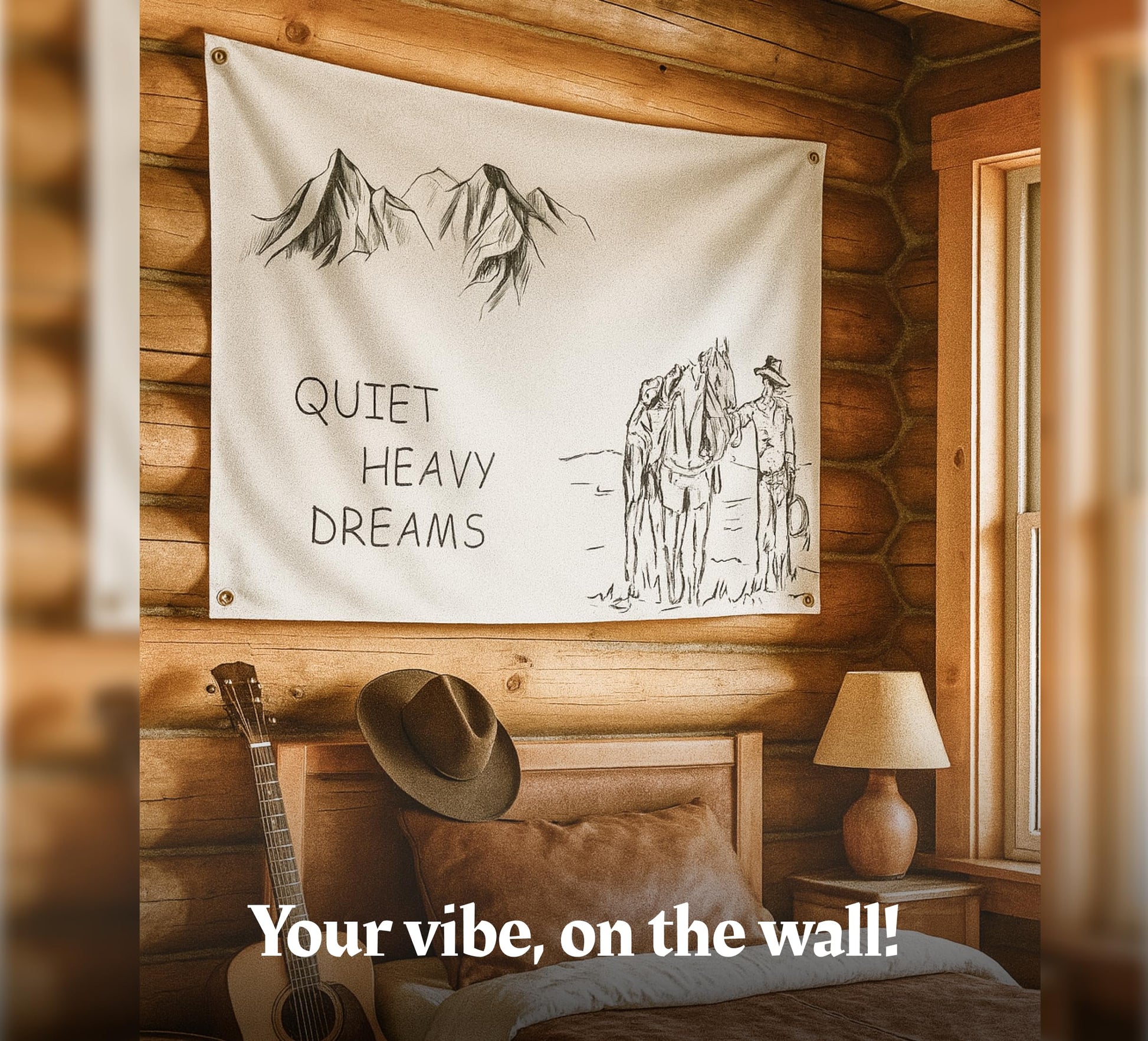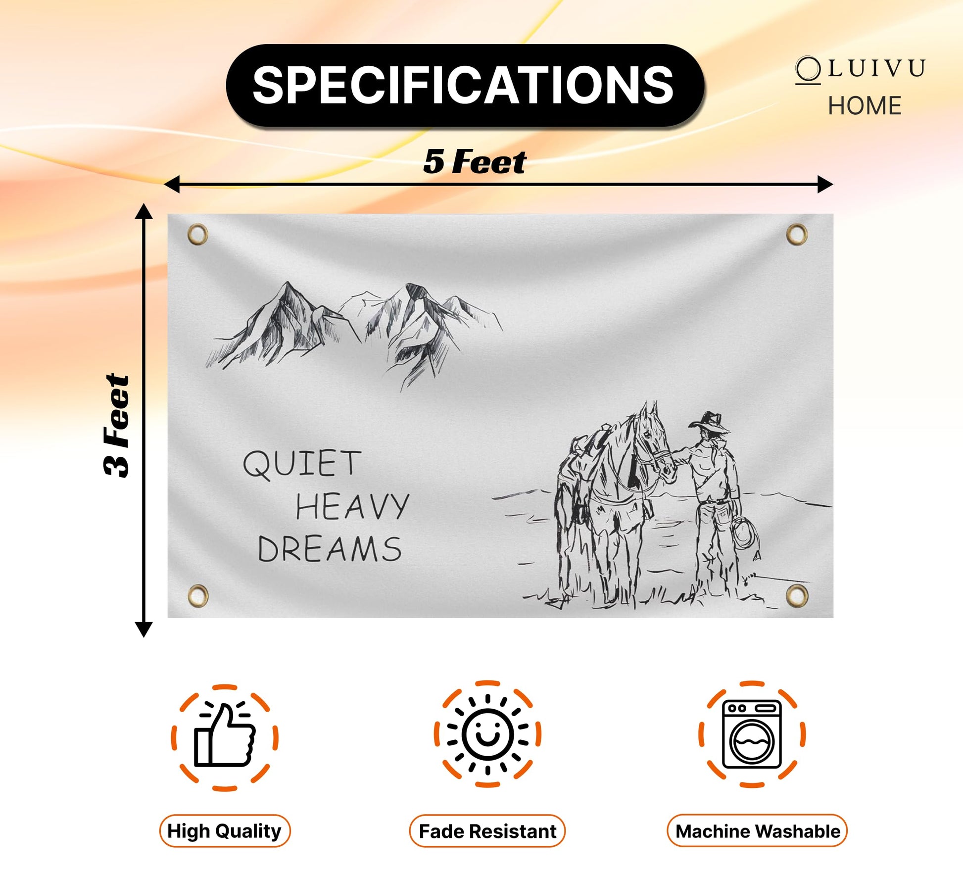 This decorative 3×5 ft banner flag (approximately 90×150 cm) features a minimalist western-style illustration combined with a calm, reflective quote. The design shows a hand-drawn landscape with distant mountains and a quiet scene.