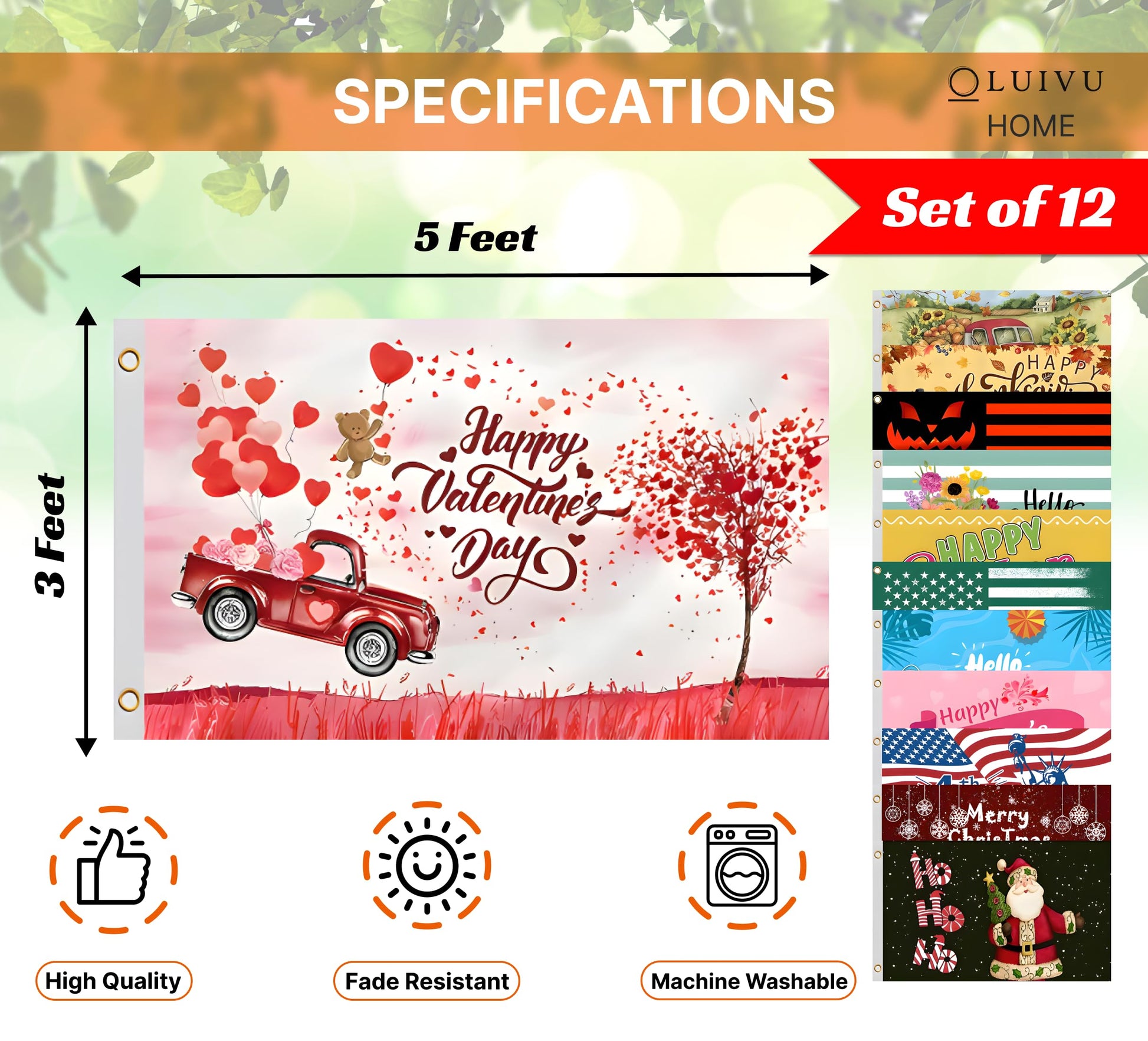 - Set of 12 flags for every important season holiday. The package includes: St. Patricks Day Flag, Easter, 4th of July, Halloween, Thanksgiving , Christmas, Valentines Day, happy Mother’s Day flag.